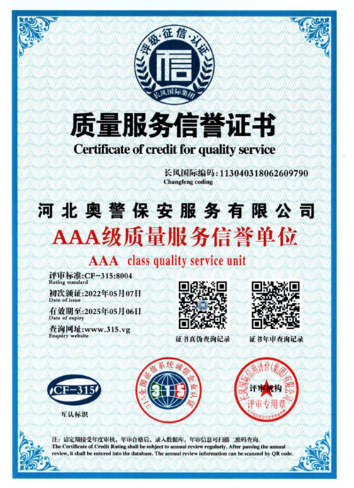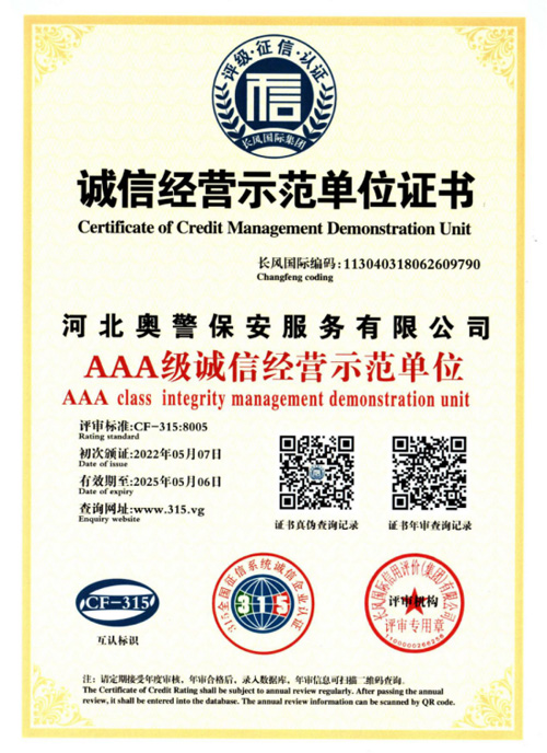 “忠誠的伙伴,非凡的朋友”,河北奧警保安服務(wù)有限公司本著“客戶的需求就是我們的追求”的服務(wù)理念,與廣大客戶攜手并進(jìn)、共創(chuàng)恢弘偉業(yè)。
