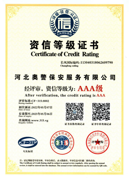 河北奧警保安服務(wù)有限公司成立于2017年7月20日,注冊資金1000萬元,具有中華人民共和國《保安服務(wù)許可證》(編號:冀公保服20180085)的綜合性安保企業(yè)。